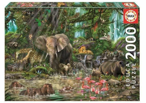 Op deze legpuzzel spot je Afrikaanse dieren in de jungle. De puzzel bestaat uit 2000 stukken en heeft een afmeting van 96 x 68 cm.