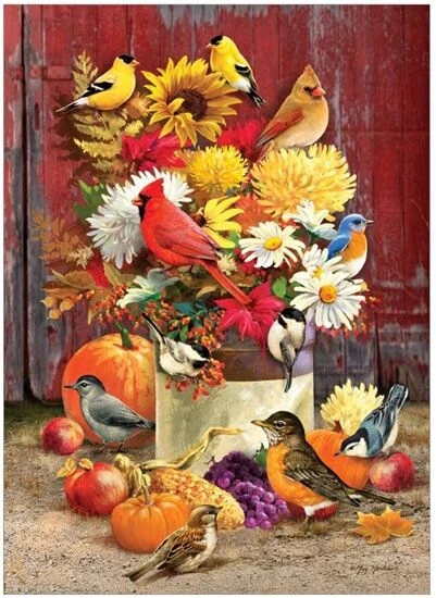 Deze puzzel bevat een afbeelding met een prachtig herfstboeket dat omringd is met fruit, vogels en pompoenen.