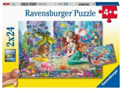 Dit zijn twee kinderpuzzels met als thema zeemeerminnen. De puzzels bestaan elk uit 24 puzzelstukken en hebben een grootte van 26 x 18 cm.