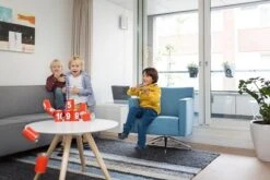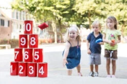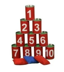 Dit blik gooispel bestaat uit 10 rode blikjes die genummerd zijn van 1 tot 10 en 3 zandzakjes.