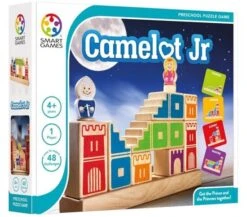 Camelot JR van Smart Games is een stevig houten denkspel voor jonge kinderen. Met de blokken probeer je een weg te bouwen zodat de ridder tot bij de prinses kan komen zonder te springen.