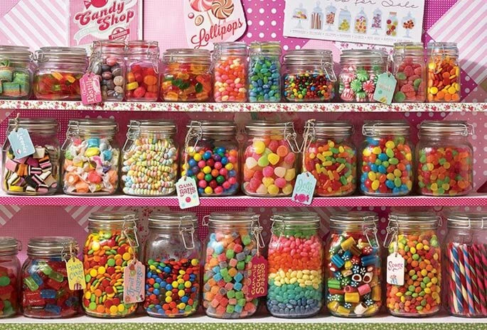 Deze puzzel van de snoepwinkel doet je vast watertanden. De kleurrijke puzzel staat vol met zoete lekkernijen. Er staan maar liefst achtentwintig bokalen met snoepjes op de planken van de snoepwinkel. Kauwgomballen, smarties, drop, pepermunt, jelly beans etc.
