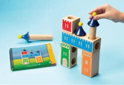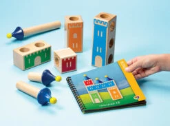 Castle Logix is een stevig houten denkspel voor jonge kinderen. Door logica, ruimtelijk inzicht en fijne motoriek te combineren, bouw je de mooiste kastelen met Castle Logix. Probeer het kasteel op de opdrachtenkaart exact hetzelfde na te bouwen met de houten blokken. Maar let op dat de ene toren de andere niet blokkeert!