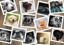 Dit is een hondenpuzzel die uit 1500 stukjes bestaat. De afbeelding is een collage van dertien verschillende honden.