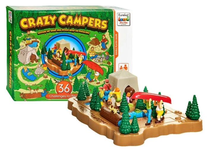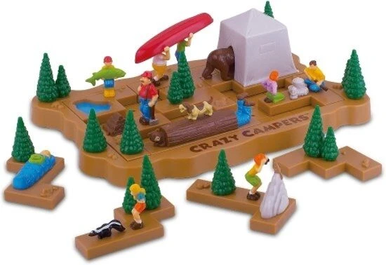Crazy Campers is een heel mooi spel in het thema kamperen. Het bevat 36 verschillende opdrachten. Bij iedere opdracht zijn 1 of 2 (van de 11) puzzelstukken al gegeven. De bedoeling is om alle andere stukken op het bord te plaatsen zodat de kampplaats volledig bedekt is.