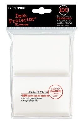 Dit zijn witte card sleeves van het merk Ultra Pro voor standaard kaarten (66 x 91mm). Een pakje bestaat uit 100 witte deck protectors.
