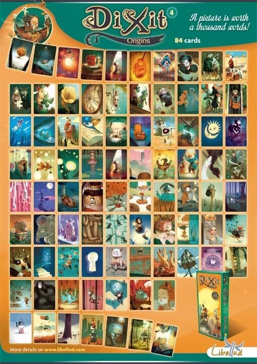 Dixit 4: Origins bestaat uit 84 kaarten die als spel op zich gespeeld kunnen worden, of in combinatie met het spel Dixit of met het Dixit Odyssey.