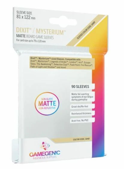 Deze bordspelsleeves (81x122mm) bieden een hoogwaardige bescherming voor bordspelkaarten tot 79×120 mm en bevatten een matte laminering (non-glare). Geschikt voor onder andere Dixit, Mysterium, Legends of Andor, London, Inis, Escape Tales The Awakening, Detective Club, Flash Point Fire Rescue en Path of Light and Shadow.