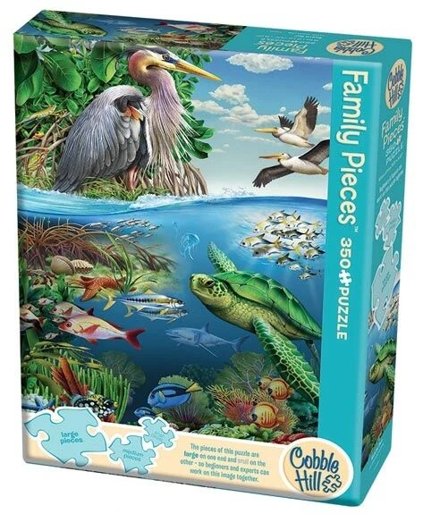 De familiepuzzel Earth Day van Cobble Hill bestaat uit 350 stukken. Aan de ene zijde bestaat de puzzel uit kleine stukjes, aan de andere kant uit grote stukken en in het midden stukken van gemiddelde grootte. Zo kan de hele familie samen puzzelen.