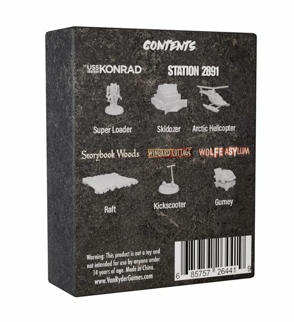 This Vehicle Miniatures set includes the following vehicles: Super Loader, Skidozer, Arctic Helicopter, Raft, Kickscooter, Gurney.