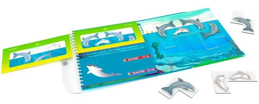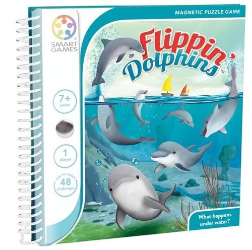 Dolfijnen zijn speelse en intelligente dieren. Kan jij ook uitzoeken wat ze onderwater allemaal doen? Flippin’ Dophins is een denkspel om alleen te spelen. Je gaat telkens op zoek naar de enige juiste plek voor de 7 magnetische puzzelstukken. Er zijn 48 verschillende opdrachten die gaan van makkelijk tot razend moeilijk.