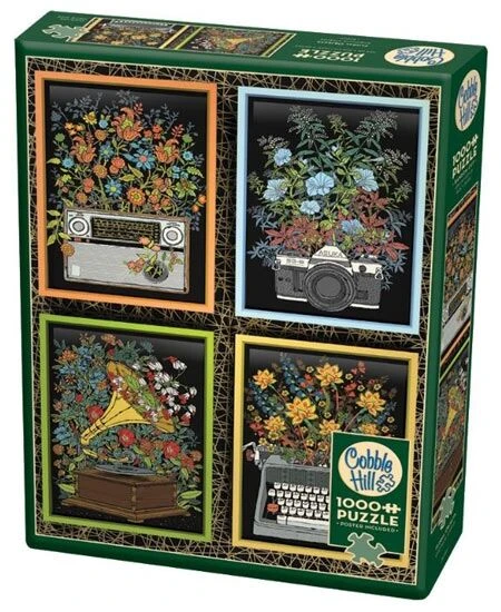 De puzzel Floral Objects bevat een vintage afbeelding die bestaat uit vier oude apparaten die omringd zijn door bloemen. Het is een legpuzzel van 1000 stukken, van het merk Cobble Hill. De afbeelding is ca. 49 x 67 cm.