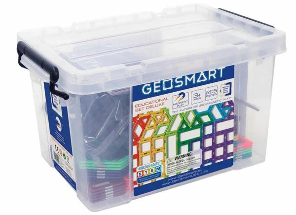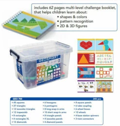 Deze GeoSmart Educational Deluxe Set bestaat uit maar liefst 205 onderdelen. Er zit een multi-level uitdagingsboekje bij van 62 pagina’s. Dit helpt kinderen om over kleuren en vormen te leren, patronen te herkennen en 2D en 3D figuren te maken.