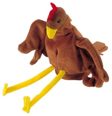 Dit is een handpop van een kip. Er past een volledige hand in de pop. Met je vingers kan je de vleugels en de kop van de kip bewegen.