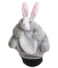 Deze handpop van een konijn is ongeveer 20 cm groot.