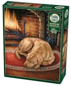 Dit is een puzzel speciaal voor hondenliefhebbers. Op de afbeeling van Home is where the Dog is zie je een hond die een dutje doet op een mat voor de haard.