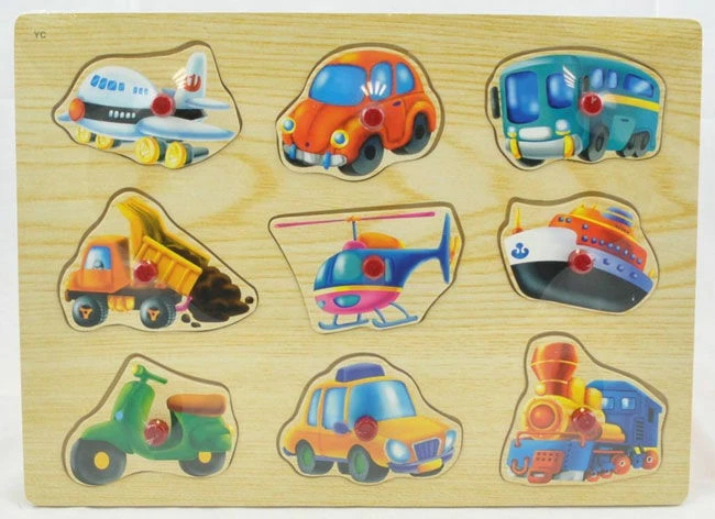 Dit is een inlegpuzzel met 9 verschillende voertuigen: een vliegtuig, een auto, een bus, een graafmachine, een helikopter, een boot, een scooter, een taxi en een locomotief.