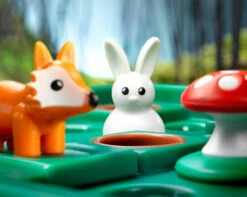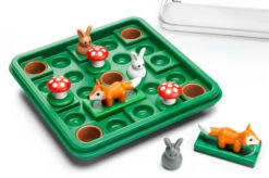 Spelregels Jump’in? Je kiest een opdracht en plaatst de konijnen, vossen en paddenstoelen op het spelbord zoals op de afbeelding is aangegeven. Daarna verplaats je de konijnen en de vossen totdat alle konijnen veilig in een bruin holletje zitten. Soms kan het zelfs zijn dat een konijn even terug uit een holletje moet springen om doorgang te geven aan een ander konijn. Boven de opdrachten staat een klein hulpmiddel, namelijk het aantal stappen dat je moet doen om tot de oplossing te komen. Er is altijd maar één oplossing mogelijk.