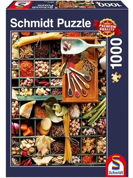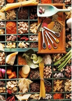 De puzzel Keuken Potpourri bestaat uit 1000 puzzelstukken. Op de afbeelding van deze legpuzzel zie je een verzameling van kruiden, specerijen en pasta’s.