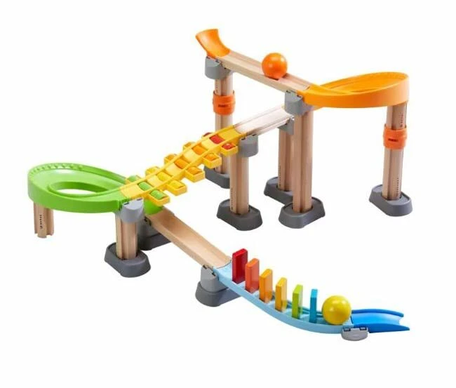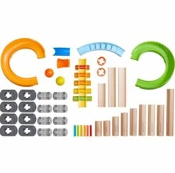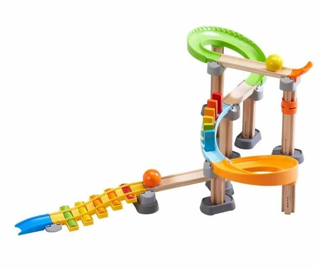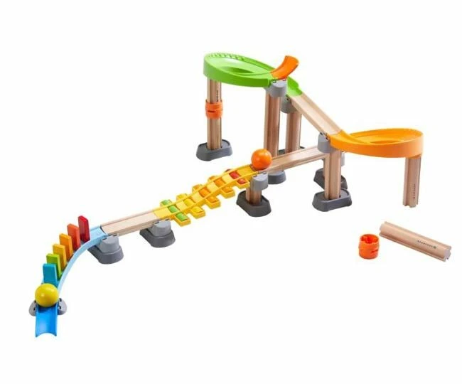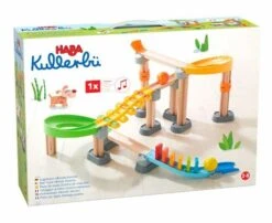 Dit is een knikkerbaan met een klanktrap. Zodra de bal over de kleurrijke trap rolt, hoor je muziek. De knikkerbaan bevat ook dominostenen die je op de dominotrap kan zetten. Leuk wanneer deze stenen met een hoop kabaal omver gegooid worden. Plezier gegarandeerd!