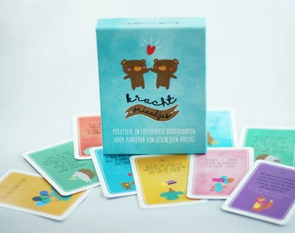 De Krachtvriendjes helpen kinderen bij het omgaan met de scheiding. De krachtvriendjes zijn speciale vriendjes voor kinderen van gescheiden ouders. Op iedere kaart staat een vriendje met een bekrachtigende boodschap of tip welke de kinderen helpt. De Krachtvriendjes geven een positieve en liefdevolle boodschap aan de kinderen.