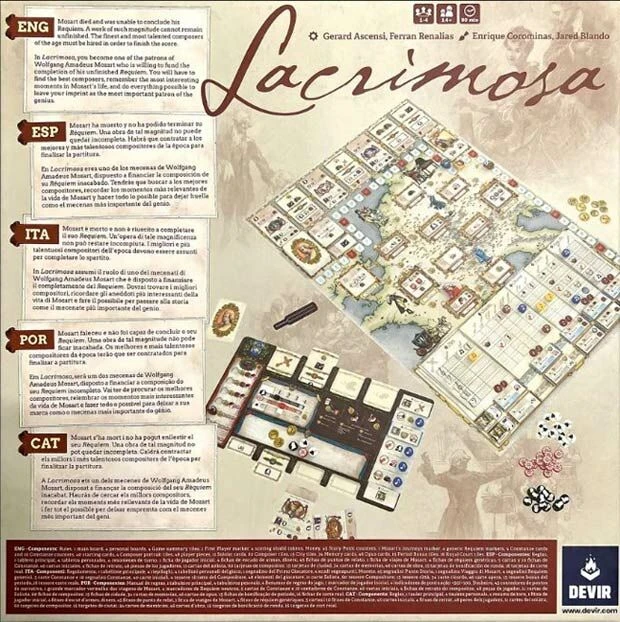 In het bordspel Lacrimosa gaan de spelers het werk van de Oostenrijkse genie financieren. Je speelt het spel in twee verschillende tijdlijnen: het heden en het verleden. In het heden geef je andere componisten de opdracht om de ontbrekende delen van het Requiem af te maken. In het verleden verzamel je middelen om de muzikant te ondersteunen in zijn carrière. Je koopt en verkoopt composities van de componist, je vergezelt hem op reizen en stelt zijn werken tentoon.