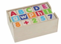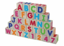 Grote, kleurrijke, stevige houten blokken met hoofdletters, kleine letters en cijfers zorgen voor urenlang plezier.