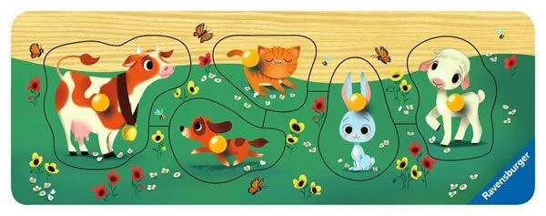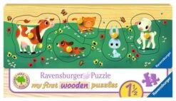De puzzel Liefste Dierenvriendjes bevat stevige houten puzzelstukken met knopjes die kleine kinderen kunnen hanteren.