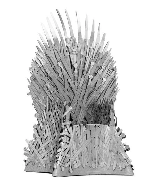 Dit is een 3d-model van de ijzeren troon uit Game of Thrones. De afmeting van de Iron Throne is 6,9 x 11 x 6,6 cm. Het bouwpakketje bestaat uit 2,5 metalen sheets.