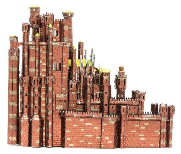 Dit is een 3d-model van The Red Keep uit Game of Thrones. Het bouwpakketje bestaat uit 2 metalen sheets waaruit je de onderdelen haalt. Met behulp van een tang kan je alles assembleren. Het afgewerkte model is 10 x 3,5 x 6,8 cm groot.