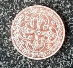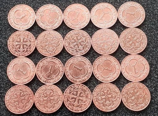 Deze munten zijn 20 mm groot en 1,5 mm dik en hebben een barokke motief.