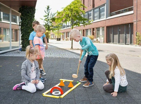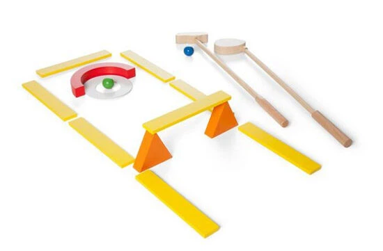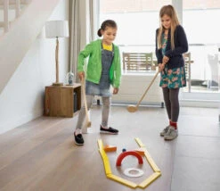Met de onderdelen van deze Mini Golf maak je een eigen golfbaan. Je maakt het zo makkelijk of zo moeilijk als je zelf wil. Wie krijgt de bal in de cirkel in de minste slagen?