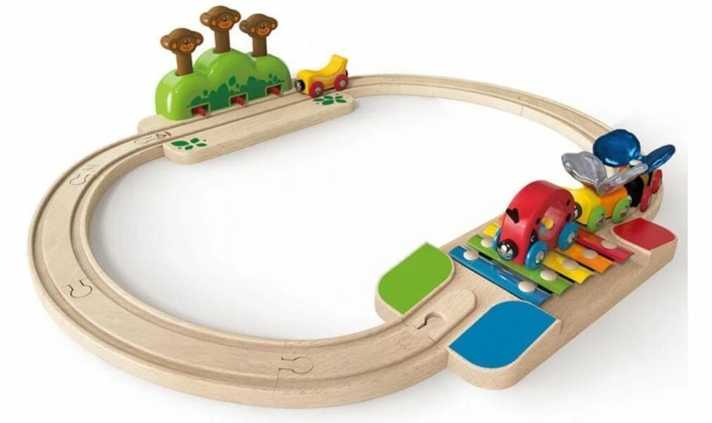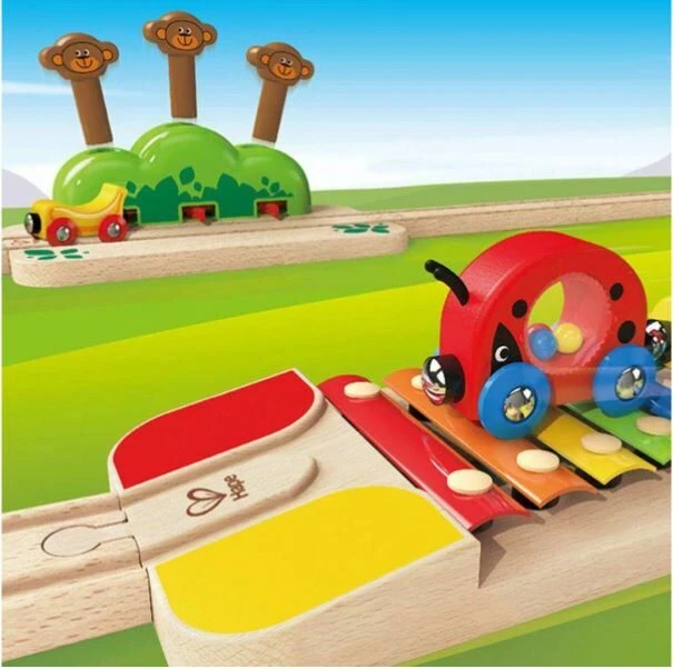 Luister hoe de wagons melodieus over de xylofoonsporen rijden en begin opnieuw!