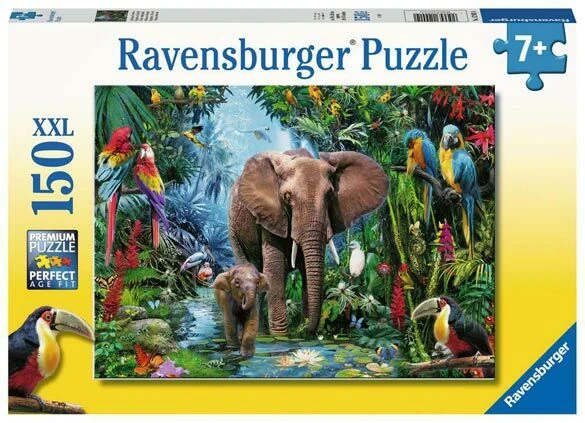 Dit is een puzzel met olifanten en andere dieren in de jungle. Het is een puzzel die bestaat uit 150 stukjes. Deze Ravensburger legpuzzel heeft een afmeting van 49 x 36 cm. Een richtleeftijd is 7+.