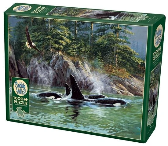 De Cobble Hill Puzzle Orcas bestaat uit 1000 puzzelstukken en is +/- 67 x 49 cm groot.