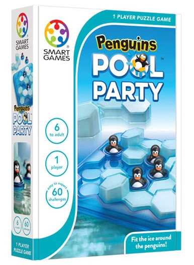Penguins Pool Party is een Smart game die geschikt is voor kinderen van 6 jaar en ouder. Van opzet lijkt Penguins Pool Party op de IQ-puzzels, maar doordat het hexagonale ijsschotsen zijn, is deze breinbreker iets moeilijker.