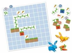 Het doel van het spel PixBlocks is ervoor zorgen dat de konijnen tot bij de wortels komen. Je programmeert het bord zodat de konijnen exact doen wat je wil.