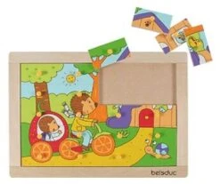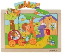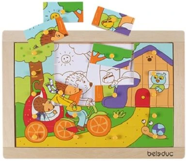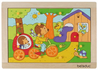 Puzzel Egel is te maken in drie moeilijkheidsgraden: met een gekleurd voorbeeld, met een lijndruk of zonder voorbeeld erachter. Deze houten puzzel is 29,5 x 20,8 x 1,8 cm groot.