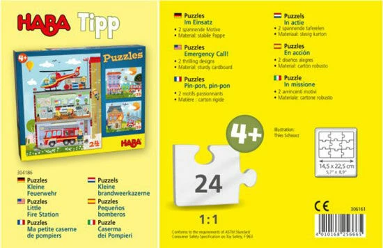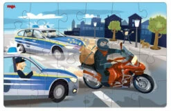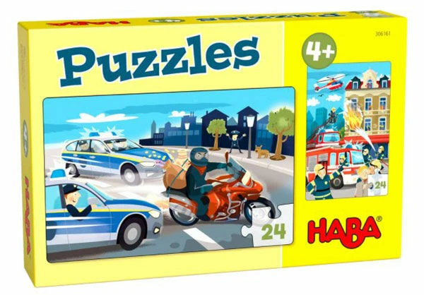 Dit zijn twee legpuzzels waar je de hulpdiensten in actie ziet. Op de ene puzzel vangt de politie een boef, op de andere puzzel redt de brandweer een gezin met een kat. De puzzels zijn gemaakt uit 24 puzzelstukken van stevig karton. De afmeting van de puzzels is 14,5 x 22,5 cm.