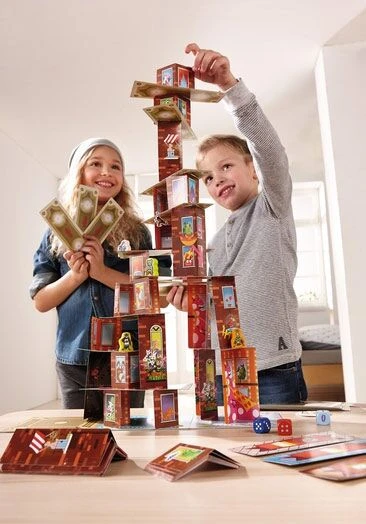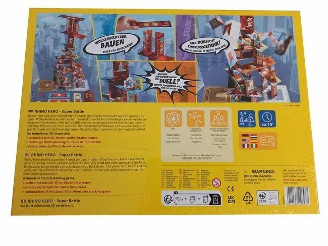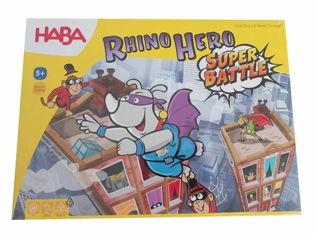 In het spel Rhino Hero Super Battle wordt op wankele wolkenkrabbers geklommen en vinden er keiharde gevechten plaats. Volgende superhelden zijn van de partij: Rhino Hero, Big E, Giraffe Boy en Batguin. Wie vecht zich naar de overwinning en laat zich bovendien niet van slag brengen door de gemene Spider Monkeys?