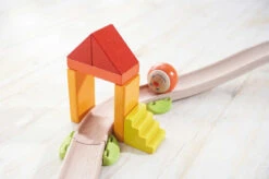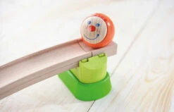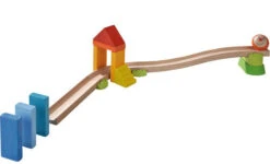 Deze Rollebollen Knikkerbaan van HABA is een geweldige startersset voor de allerkleinsten met 1 startblok, 1 helling, 1 bocht, 1 recht baanstuk, 4 verbindingsstukken, 1 trapsteen, 6 dominostenen, 2 driehoekstenen en 1 knikker Paul.