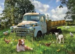 Harry, de hond, geniet van een heerlijke dag op het schapenveld. Hij wordt vergezeld door kippen, vogels en vlinders. Op de achtergrond zie je een vintage vrachtwagen.