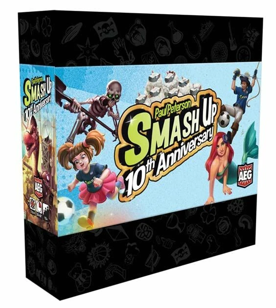 Smash Up 10th Anniversary-set bevat volgende nieuwe facties: Mermaids, Skeletons en de World Champs, evenals gloednieuwe Titans, en een herdruk van de Sheep-factie. Het bevat ook componenten waarmee je jouw Smash Up spel kan upgraden zoals basismatten, een nieuw goblin-token, en de Big Base die een geheel nieuwe manier biedt.