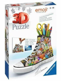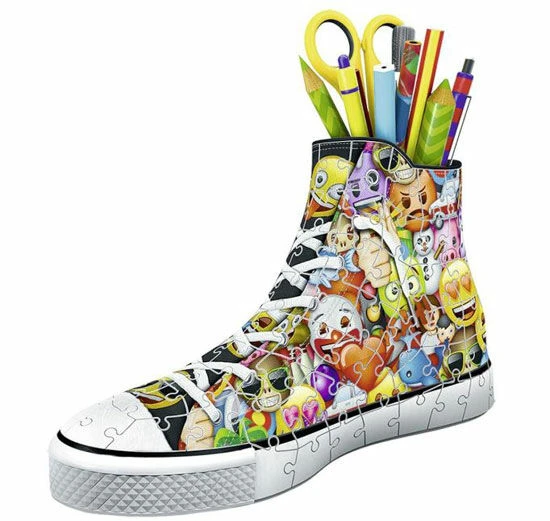 Dit is een 3D puzzel van een Sneaker met als thema Emoji. De puzzel bestaat uit 108 stevige kunststof puzzelstukjes. Gewoon puzzelen, accessoires toevoegen en klaar is jouw superpraktische sneaker! Je kan er bijvoorbeeld prulletjes, stiften of make-up in bewaren.