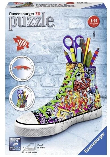 Maak deze mooie 3D puzzel van deze sneaker! De puzzel bestaat uit 108 lichtgebogen kunststof puzzelstukken. Afmetingen van de schoen: 21,4 x 7,6 x 12,4 cm.