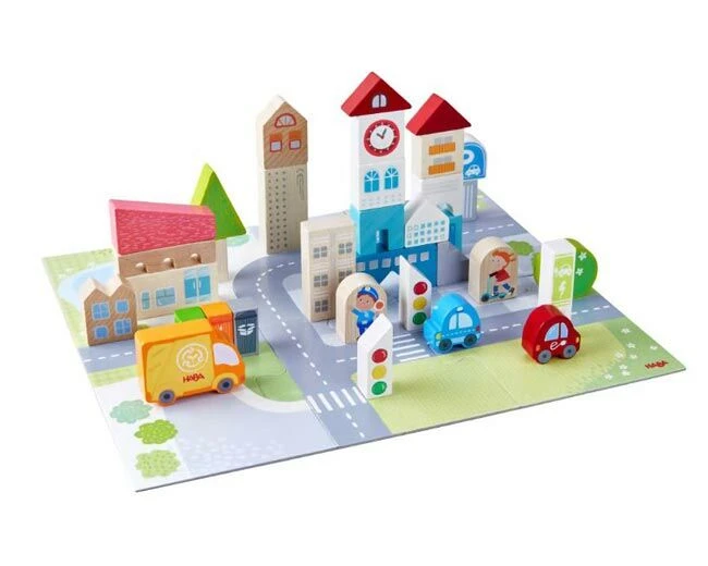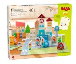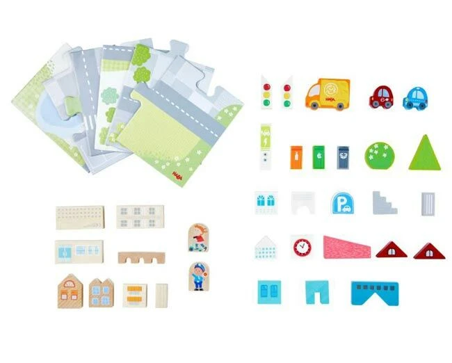 Speelwereld Puzzel Stadsleven bevat spelmateriaal bedoeld voor een kind vanaf 2 jaar. Het kind kan er zelf een stad mee maken met o.a straten, een park, appartementsgebouwen en verkeer. De houten blokken zijn groot en makkelijk te grijpen.