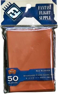 Rode Sleeves van het merk Fantasy Flight voor standaard kaarten (63,5×88 mm). Een pakje bevat 50 sleeves.