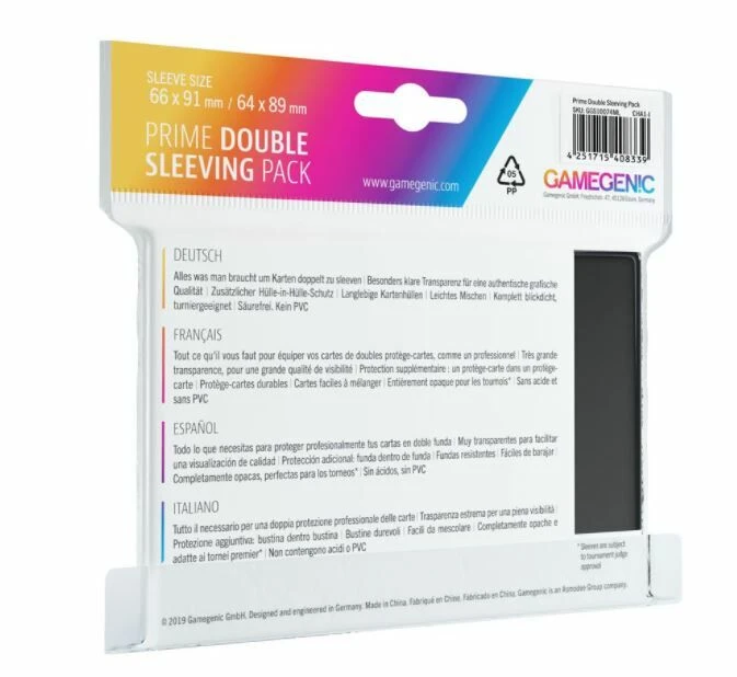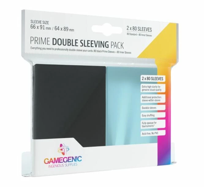 Dit Double Sleeving pack van Gamegenic bestaat uit 80 standaard zwarte Prime sleeves + 80 inner sleeves. Je kan er 80 kaarten de hoogste (een dubbele) bescherming mee geven.