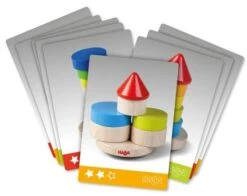 Bij het Stapelspel Wankeltoren gaan de kinderen één van de 9 voorbeeldkaarten proberen na te maken. Er zijn drie moeilijkheidsgraden.