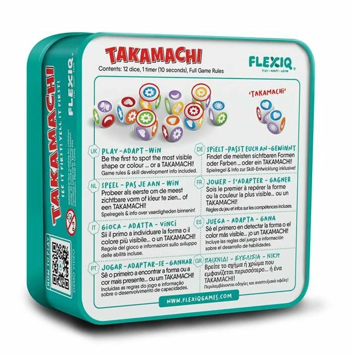 Het spel Takamachi bevat 12 dobbelstenen (met vormen en kleuren) en een zandloper van 10 seconden.